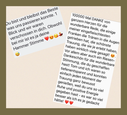 Jede Trauung ist die beste, jedes Brautpaar das schönste... und ICH schicke sie auf eine emotionale Achterbahnfahrt der Gefühle. Auf eine Reise durch ihre Liebes-Vita, bei der sie lachen, schmunzeln, klatschen, fühlen und weinen (natürlich vor Rührung) sowie unendlich viel Dankbarkeit spüren sollen.